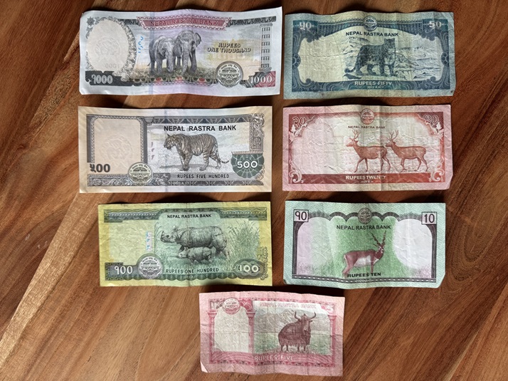 Bei den meisten Automaten sind Abhebungen auf entweder 25.000 oder 35.000 nepalesische Rupien (NPR) begrenzt und es gibt immer eine Abhebegebühr von ca. 700 NPR (= ca. € 5,-). Wir haben während unserer Reise jedes Mal den Höchstbetrag behoben und es wurden meist um die € 252,- abgezogen. Hier ist ein großer Vorteil, wenn nicht auch noch zusätzlich Gebühren für das Abheben durch die eigene Bank anfallen. Wir haben deswegen möglichst nur mit unserer DKB-Karte Geld abgehoben. Allerdings mussten wir oft den Automaten wechseln und mehrere durchprobieren, weil es häufig einfach nicht funktioniert hat.