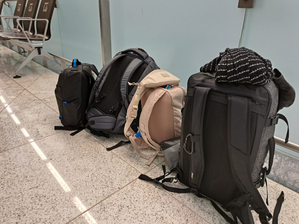 Unsere größeren Rucksäcke hatten fertig gepackt jeweils ungefähr 8 bis 9 kg Gewicht und die kleineren Rucksäcke zwischen 6 und 7 kg. Das haben wir noch zuhause mit einer Kofferwaage gemessen. Die kleineren sind deswegen auch recht schwer, da sich darin die ganze Technik befindet.