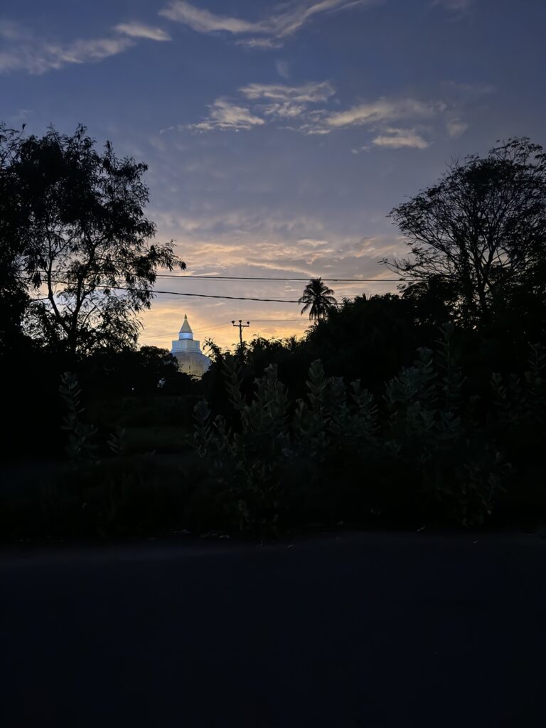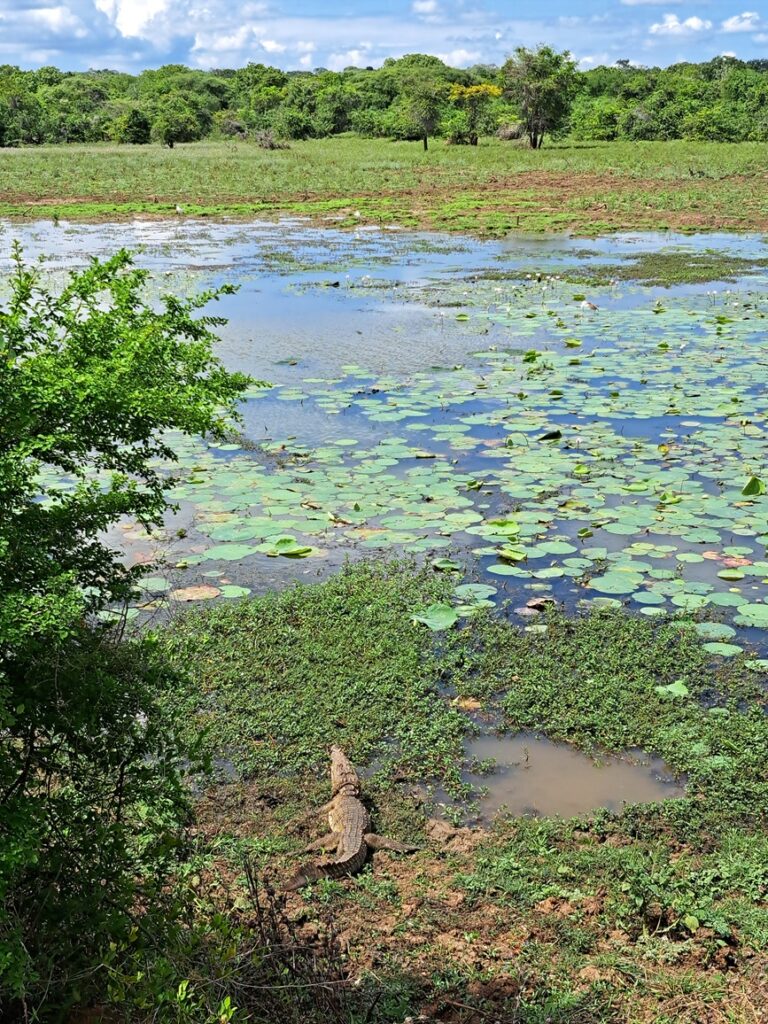 Tissamaharama Stupa: Im Anschluss brachte uns Nalin noch zu einer Stupa, um uns zu zeigen, wie er als Buddhist hier meditiert und Opfer darbringt. Wir gingen einmal um die Stupa herum, während er uns einige Informationen zum Buddhismus gab, weil wir sehr daran interessiert waren. Dann saßen wir in der Wiese und meditierten ein paar Minuten gemeinsam. Es fühlte sich so friedlich an, dort zu verweilen. Wir sollten uns alle Zeit der Welt nehmen und ich hätte vermutlich noch ewig dort einfach nur sitzen und atmen können. Ich wollte aber auch sehen, was es noch zu entdecken gab und Nalin kaufte ein paar Blumen und Räucherstäbchen und zeigte uns, wie wir sie als Opfergaben richtig positionieren sollten. Die Blüten wurden erst sorgfältig vom Stängel getrennt und dann liebevoll auf dem kleinen Altar vor der Buddhastatue aufgelegt. Die Räucherstäbchen wurden entzündet und in eine große mit Sand gefüllte Schale gesteckt. Ein Mönch leerte uns danach noch Wasser aus einer silberfarbenen Kanne in unsere Hände. Damit sollten wir unseren Kopf bzw. das Gesicht waschen. Ich vermute es handelte sich um geweihtes Wasser. Nalin meinte, dass viele Gläubige das Wasser auch trinken würden, aber das war uns persönlich etwas zu unsicher in dem Moment. Unser Darm-Mikrobiom wäre darauf eventuell nicht wirklich vorbereitet gewesen. Man kann als Tourist natürlich diese heiligen Orte auch mühelos auf eigene Faust erkunden, aber es war für uns ein ganz besonderes Extra so eine detaillierte Einweisung von einem einheimischen Buddhisten zu bekommen. Wir sind Nalin sehr dankbar für seine Gastfreundschaft.