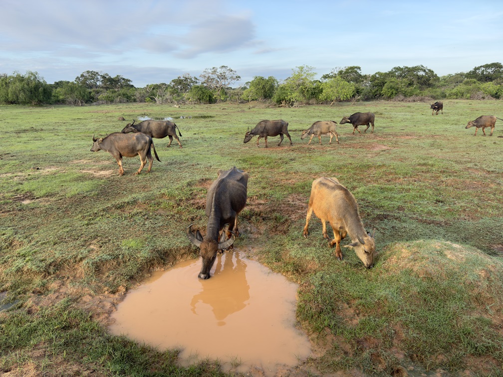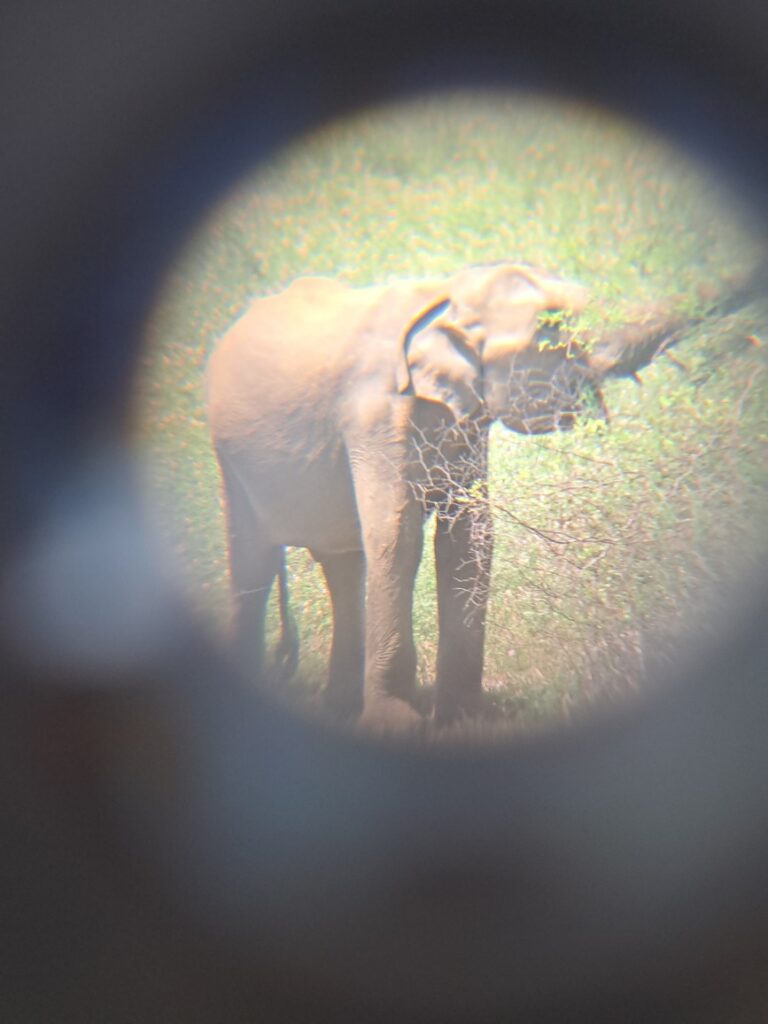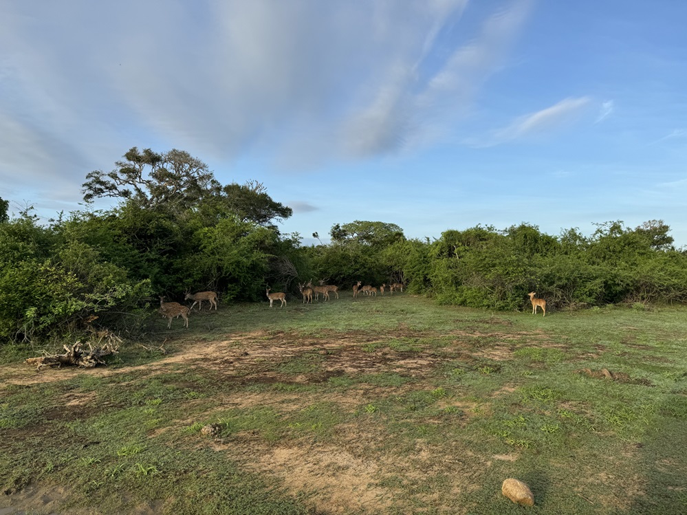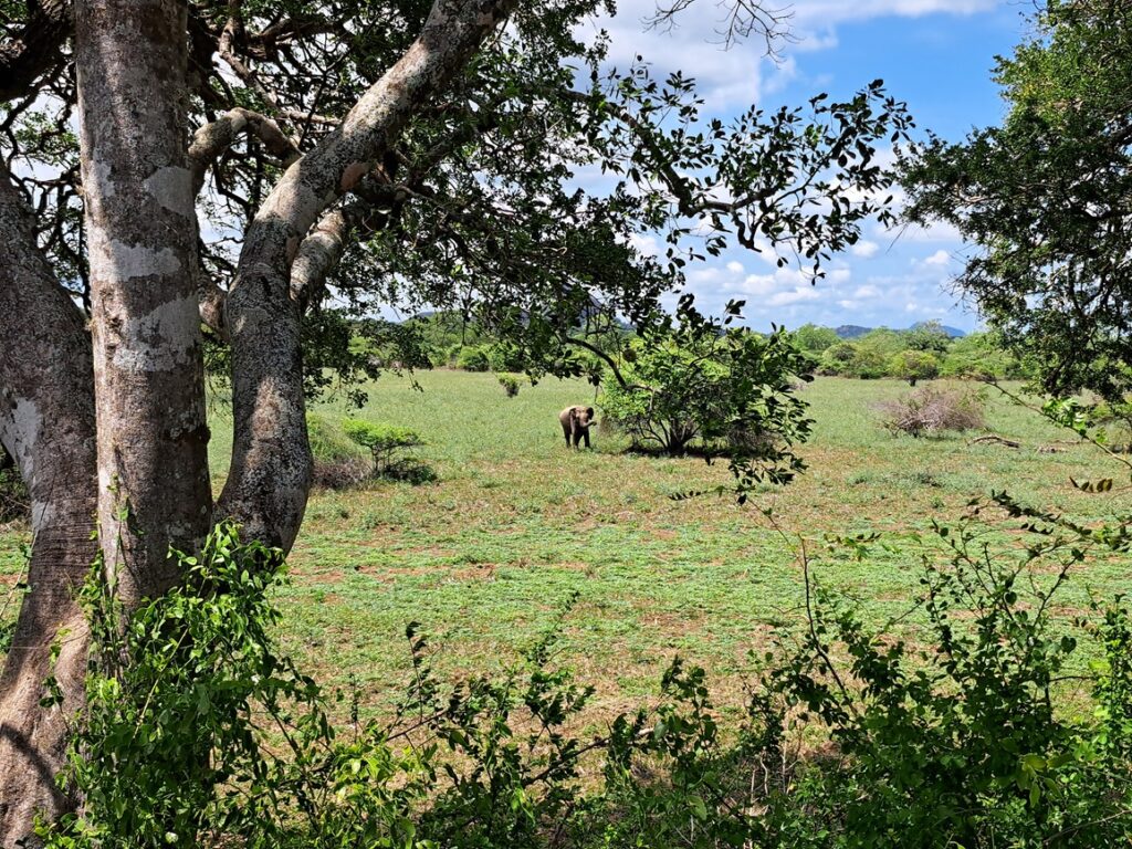 Safari im Yala Nationalpark: Da es unsere allererste Safari überhaupt war und wir sehr gespannt darauf waren, buchten wir gleich das volle Programm – eine 12-hours-private-Jeep-Tour. Es gab auch die Möglichkeit für etwas weniger Geld nur eine Halbtagestour (6 Stunden) und/oder auch mit anderen Gästen zusammen (insgesamt 6 Personen pro Jeep) zu machen. Wir hörten, dass die Chance einen Leoparden zu sehen natürlich bei einer Ganztagestour größer sei und man auch eine entspanntere Fahrt hätte, wenn man privat mit eigenem Jeep unterwegs sei, daher entschieden wir uns dafür. Insgesamt bezahlten wir für das teuerste Paket umgerechnet ca. € 104,- pro Person. Die Tour startete um 04:30, jedenfalls wurden wir um diese Zeit mit dem Jeep von der Unterkunft abgeholt. Wir bekamen Essen für den ganzen Tag in mehreren Körben und mehr als ausreichend Wasser mit. Dann fuhren wir zum Nationalpark und der Guide kümmerte sich um den Eintritt. In der Schlange warteten wir mit einigen anderen Jeeps bis die Tore des Parks um 06:00 geöffnet wurden. Da die vielen Jeeps aber alle unterschiedliche Wege befuhren, verlief es sich innerhalb der ersten Minuten bereits. Die meiste Zeit waren wir allein unterwegs. Ab und zu trafen wir auf andere Jeeps und die Fahrer tauschten sich kurz aus, wo was gesehen wurde, um allen eine möglichst gute Erfahrung zu ermöglichen. Das Praktische an der privaten Tour war, dass wir ständig die Sitzplätze wechseln konnten, um so bessere Sicht zu haben und auch, dass der Guide nach unseren Wünschen stehen bleiben oder weiterfahren konnte. Wir konnten einige Tiere sehen, wie z.B. Wasserbüffel, Schakale, Affen, Warane, Rehe, Krokodile, Wildschweine, Pfaue und unzählige andere Vogelarten, unter anderem sogar einen Nashornvogel. Unser Guide war ständig auf der Suche nach Leoparden und wir hatten die Hoffnung schon fast aufgegeben, doch konnten dann doch noch einen ziemlich großen und sogar relativ nahe schnell wieder im Busch verschwinden sehen. In der zweiten Hälfte, nach der Mittagspause, fuhren wir noch tiefer in den Park hinein und sahen viele Elefanten. Junge Männchen, die alleine unterwegs waren beobachteten wir in der Ferne durch den Ferngucker und aber auch große Elefantenkühe mit ihren Babys ganz nah, als sie direkt am Jeep vorbei gingen. Für uns war das ein wirklich spannendes Erlebnis und wir bereuen nicht, die Safari gemacht zu haben.