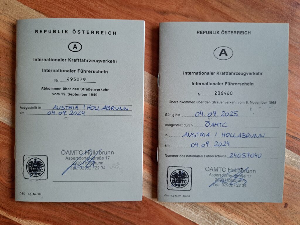 Um wirklich sicherzugehen haben wir uns (empfohlen von der Dame am Schalter beim ÖAMTC) zwei unterschiedliche internationale Führerscheindokumente geholt. Zum einen das „Wiener Übereinkommen über den Straßenverkehr von 1968“ und zum anderen auch noch das „Genfer Abkommen über den Kraftfahrzeugverkehr von 1949“. Scheinbar benötigt man in manchen Ländern Asiens das eine und in anderen Ländern das andere Dokument. Uns hat das Ganze also € 35,80 pro Person (+ jeweils zwei Passfotos) gekostet, da Constantin zu dem Zeitpunkt glücklicherweise noch ÖAMTC-Mitglied war.